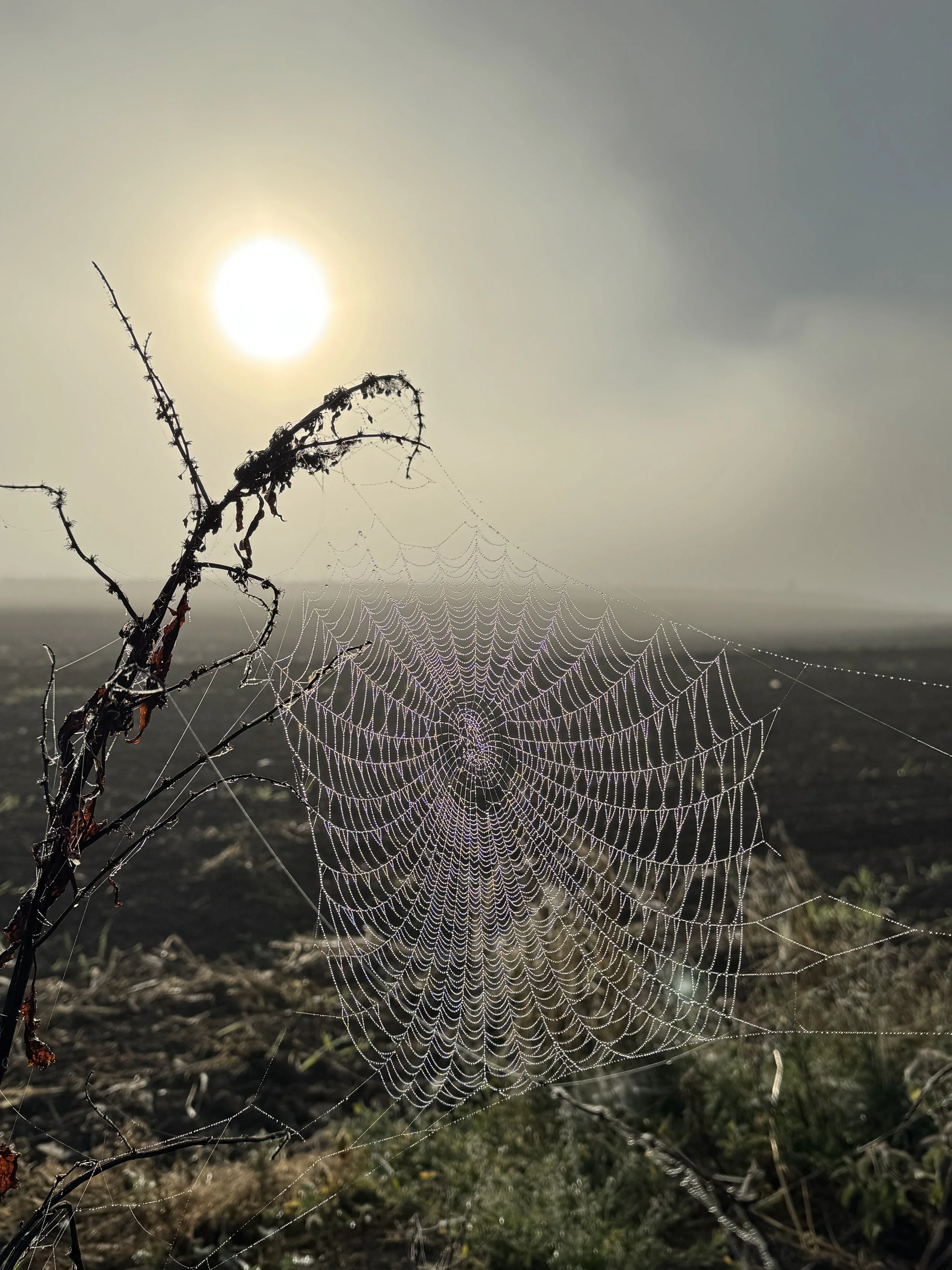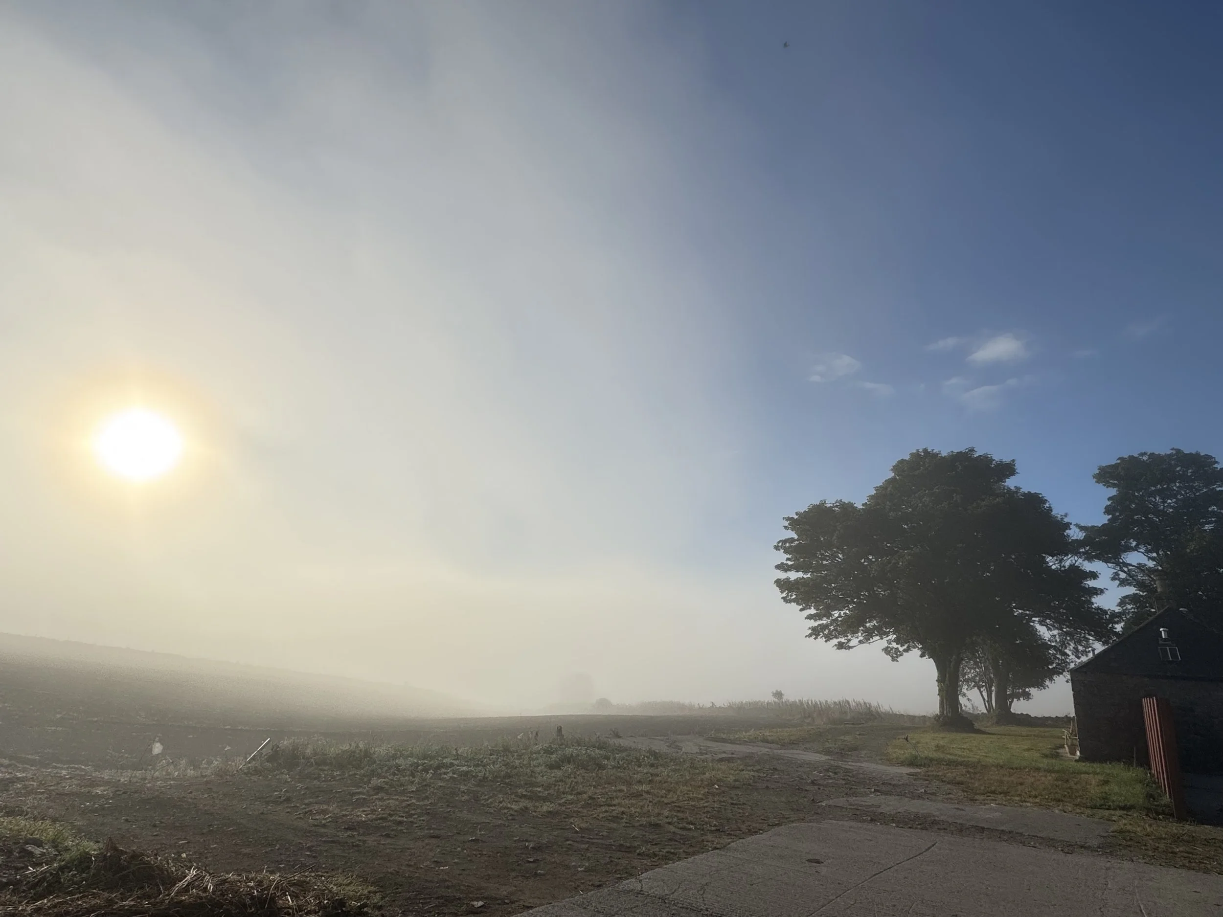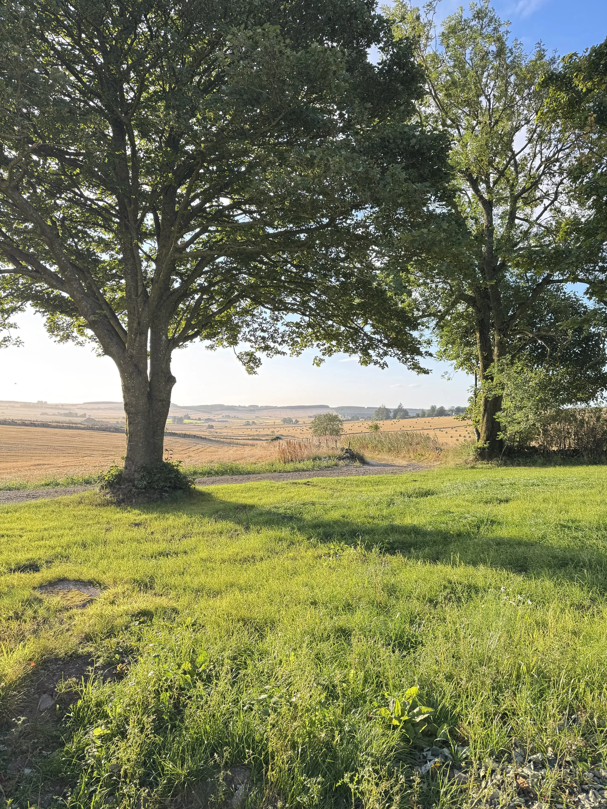 View of a rural landscape through a window, showing a large grassy yard, a dirt path, fields of wheat or barley, and a tree with overhanging branches under a cloudy sky.